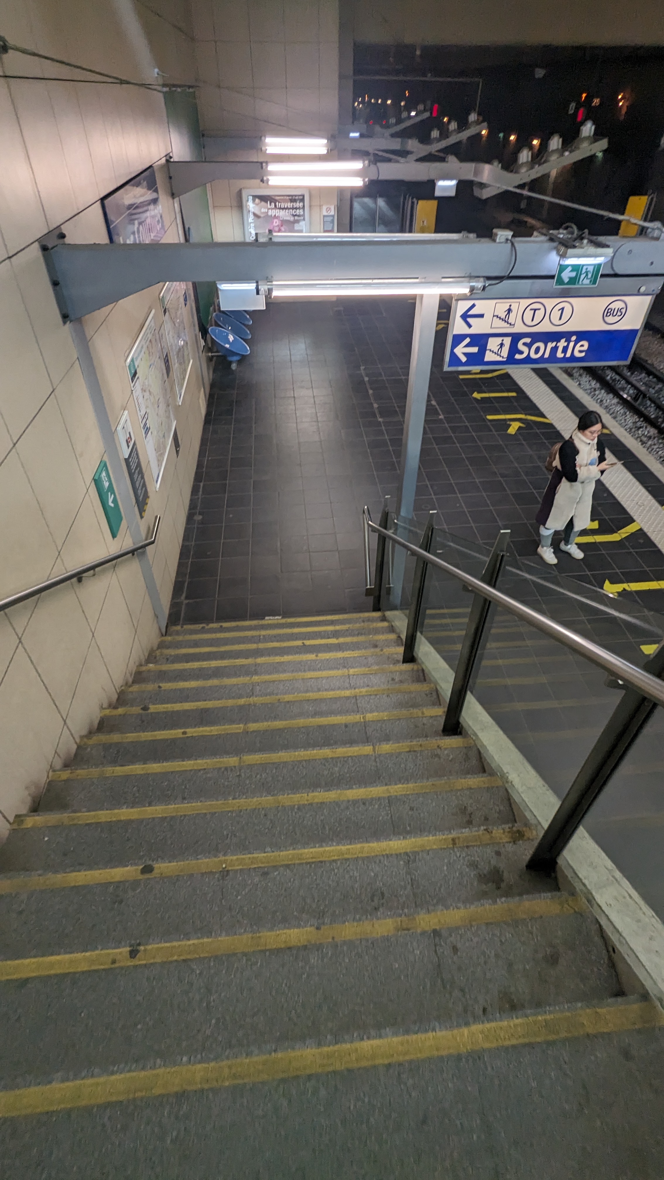 Le métro s'arrête régulièrement sur le quai opposé.. donc pas d'escalier mécanique et ruée (donc attente) vers l'unique ascenseur. Pas top pour les personnes à mobilité réduite, les personnes avec poussettes ou valises !